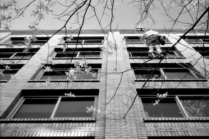 Fall window washing motif in downtown Seattle. Leica M6 and Kodak HIE infrared with 87C filter.